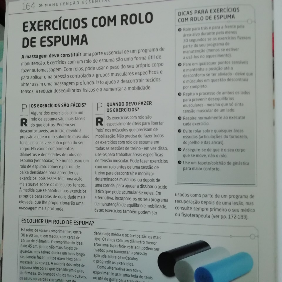 Já vos falei várias vezes da importância de usar um rolo de espuma para tratar bem dos músculos. O processo é muito doloroso e deixa algumas mazelas durante uns dois dias, mas os seus benefícios superam tudo isso amplamente. Faço, pelo menos, uma vez por semana e um minuto em cada grupo muscular, dando primazia aos músculos das pernas. O livro Corrida é maratona explica muito bem como escolher (ver acima) e como usar (ver abaixo). Espero que vos ajude tanto quanto a mim. (...)